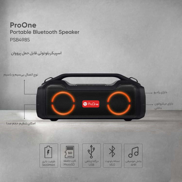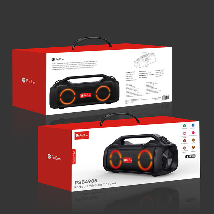اسپیکرهای بیسیم یکی از جذابترین لوازم جانبی هستند که تاکنون طراحی و تولید شده است. بلندگوهای بیسیم با فراهم آوردن امکان پخش موزیک بدون وابستگی به کابل شارژ کاربران را در هر شرایط و محیطی همراهی میکنند. اسپیکر بلوتوث پرووان مدل PSB4985 یک ابزار برای پخش فایلهای صوتی است. به دلیل طراحی منحصربفرد اسپیکر PSB4985 صدا در محیط به صورت کامل پخش میشود. با قابلیت ویژه TWS در این اسپیکر، شما میتوانید دو اسپیکر پرووان PSB4985 را به هم متصل کرده و حجم صدای موسیقی را دو برابر کنید.اسپیکر پرووان PSB4985 یک اسپیکر پرتابل است که دارای دستگیره است و به راحتی هر جایی که بخواهید میتوانید آن را همراهتان ببرید.با اسپیکرهای پرووان بدون نیاز به گوشی با کیفیتی بالا تماسهای خود را جواب بدهید که تنها کافی ست دکمه پاور را دوبار فشار بدهید. یکی از ویژگیهای مهم این اسپیکر قابلیت شارژ گوشی است و جدا از اسپیکر یک پاوربانک است که به راحتی گوشی شما را با کابل شارژ میکند.اسپیکر بلوتوثی قابل حمل PSB4985 ضد آب بوده و دارای استاندارد IPX5 است. این اسپیکر با ابعادی معادل طول 390، عرض 137 و ارتفاع 175 میلیمتر طراحی و تولید شده است و قطر هر دو طرف اسپیکر 3.5 اینچ است که خود اسپیکر وزنی معادل 2700 گرم دارد. زیر اسپیکر دو پایه مسطح جهت قرار دادن اسپیکر روی سطوح طراحی شده و در قسمت بالای اسپیکر PSB4985 یک پنل کاربردی جهت قطع و وصل کردن، عقب و جلو زدن موسیقی، تغییر حالات پخش و دکمه روشن و خاموش قرار دارد. این اسپیکر دارای رادیو و میکروفون داخلی است و پورتهای اتصال USB، جک 3.5 میلیمتری صدا و شیار کارت حافظه و ورودی شارژ اسپیکر قرار دارد. قدرت این اسپیکر در مجموع 40 وات بوده و دارای باتری 3600 میلیآمپر با 7.4V است که بطور نرمال 4 ساعت زمان پخش موسیقی دارد و مدت زمان شارژ آن 5 ساعت است. اسپیکر زیبا و جذاب PSB4985 دارای رقص نور RGB است که با آهنگ تم رنگی جذابی را به تصویر میکشد.