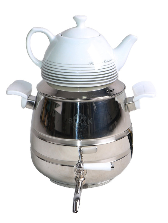 طول شیر: ۱۲ سانتیمتر - فاصله بین دستهها: ۲۲ سانتیمتر - دارای صفحه برای قرار دادن کتری - دارای خروجی بخار آب جنس بدنه استیل ضخیم ۱۸/۱۰ آهنربا نگیر براق ضد زنگ
