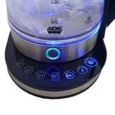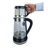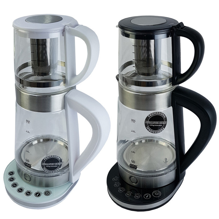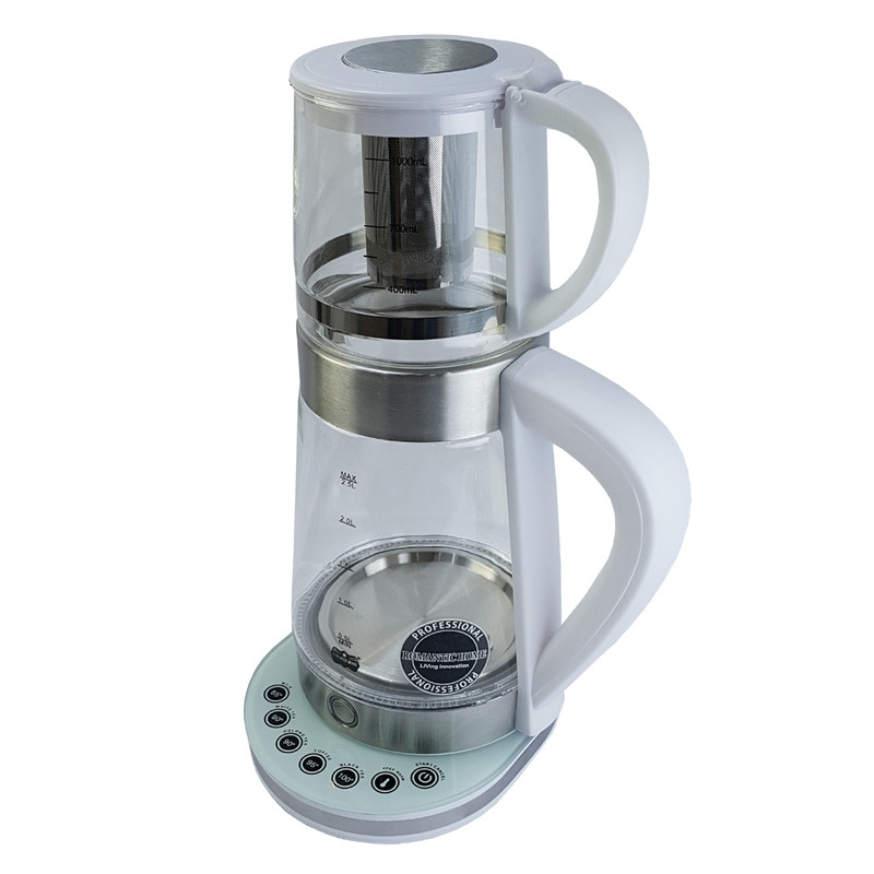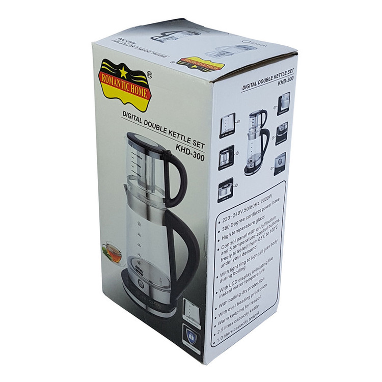 چای یکی از نوشیدنی های جدا نشدنی از زندگی ما ایرانیهاست که امروزه در شکلهای مختلف و طعمهای متنوع به بازار ارائه میشود و برای داشتن یک نوشیدنی خوش عطر و طعم به یک چای ساز حرفه ای نیاز داریم. چای ساز و دم نوش ساز رمانتیک هوم مدل KHD-300 یکی از انواع این چای ساز و دمنوش سازهاست که در بازار لوازم خانگی موجود است و مناسب جهت استفاده در منزل و یا محل کارتان میباشد. این چای ساز محدوده ی توان مصرفی 1500 تا 2000 وات دارد و بدنه اش از ترکیب شیشه و استیل ضد زنگ میباشد؛ دسته های کتری و قوری جهت ایمنی در حین استفاده از پلاستیک با کیفیت ساخته شده و در دو رنگ سفید و مشکی ارائه شده است. مشخصه منحصر به فردی که این چای ساز را از دیگر محصولات مشابه در بازار جدا میکند حالت گرم نگهدانده آب جهت دم آوری بهتر چای یا دمنوش و همچنین جلوگیری کردن از سیاه و یا کهنه شدن نوشیدنی شماست صفحه ی گرم کننده لمسی آن دارای کلیدهای مختلف جهت تنظیم دماهای متفاوت و استفاده بهینه از مصرف برق است و کارایی متفاوت به شرح زیر است: • 65 درجه دمای مناسب جهت گرم کردن شیر • 80 درجه دمای مناسب جهت استفاده برای دم آوری چای سفید • 90 درجه دمای مناسب جهت استفاده برای دم آوری انواع دمنوش • 95 درجه دمای مناسب جهت استفاده برای دم آوری انواع قهوه • 100 درجه دمای مناسب جهت استفاده برای دم آوری چای سیاه • کلید مخصوص حالت گرم نگه دارنده آب • کلید روشن و خاموش دستگاه نوع طراحی دستگاه اجازه چرخش 360 درجه کتری را روی صفحه به شما میدهد به این ترتیب افراد چپ دست نیز میتوانند در استفاده از آن راحت باشند.در نظر داشته باشید پس از برداشتن کتری از روی صفحه عملکرد آن قطع خواهد شد. از دیگر مزیت های این چای ساز قابلیت خاموشی خودکار در جریانهای بالاتر از 30 میلی آمپر و همچنین دارا بودن محافظ گرمای بیش از حد را میتوان مورد توجه قرار داد. صافی جداشونده داخل قوری ساخته شده از استیل ضد زنگ دارای ارتفاع 9 سانتیمتر و قطر دهانه ی 5.5 سانتیمتر جهت شست و شوی آسان میباشد. توجه داشته باشید که قبل از اولین استفاده حتما 3 مرتبه آب درون کتری را به نقطه ی جوش رسانده و تعویض کنید.